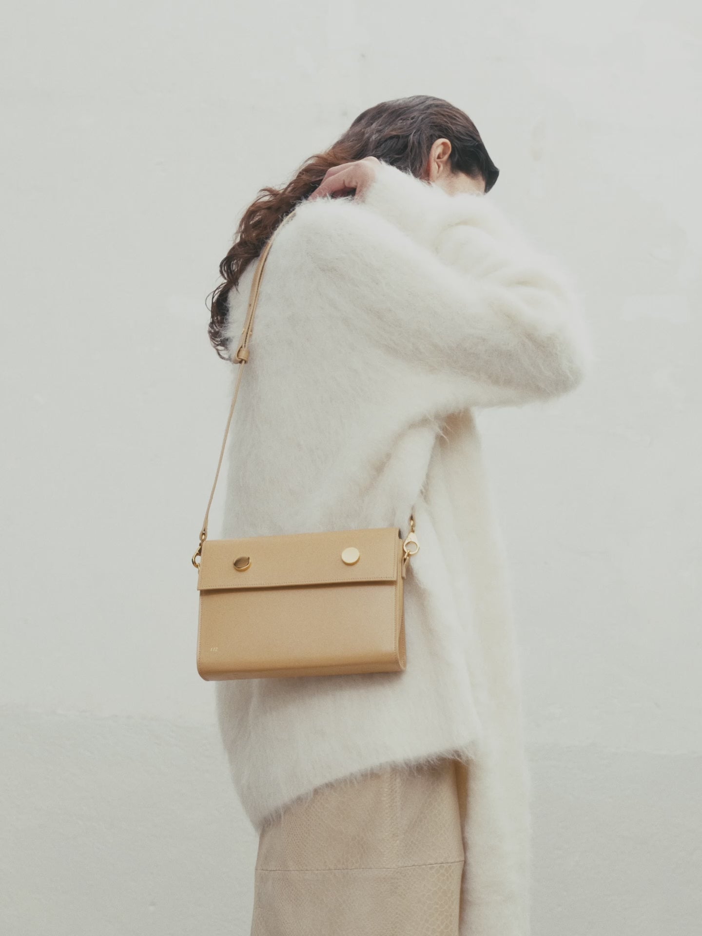 The Golden Eyes is our iconic design from our very first collection. It was so named for the two pieces of gold-tone hardware that feature on the front and are evocative of a face.